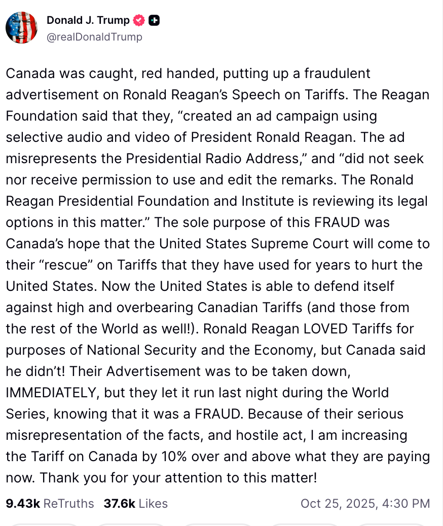 Donald Trump a annoncé sur Truth Social qu'il augmenterait de 1% les droits de douane sur les produits canadiens après que l'administration Ford a diffusé une publicité pendant le premier match des World Series au baseball.